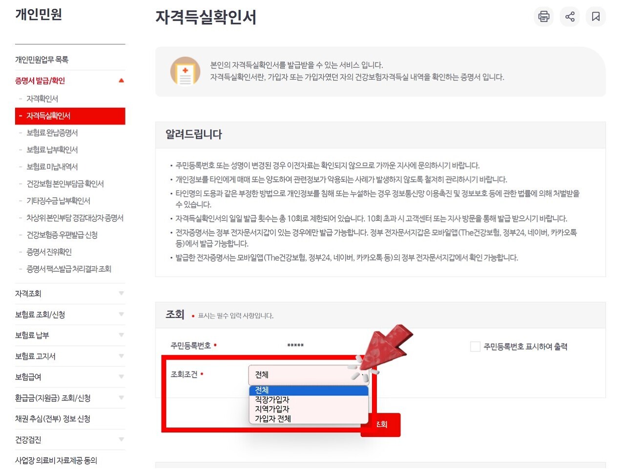 5.주민등록번호를 기재하고 조회조건에 직장가입자, 지역가입자, 가입자 전체 중 하나를 선택하고 조회하기를 눌러주세요.