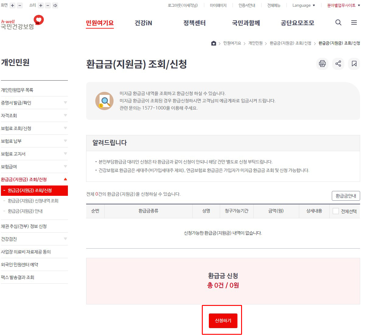 5. 환급금 조회/신청을 누르면 건강보험 환급금 조회를 할 수 있습니다. 만약 돌려받을 환급금이 있다면 하단에 신청 버튼을 눌러서 신청하실 수 있습니다.