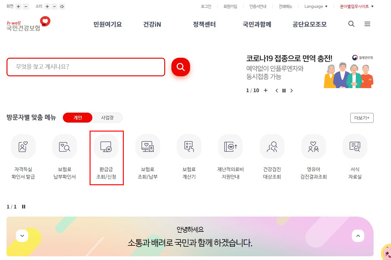 1. 국민건강보험 사이트 접속 → 환급금 조회/신청