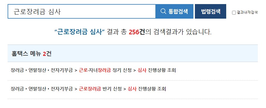 검색창에 근로장려금 심사라고 검색하시면 정기 신청과 반기 신청에 대한 근로장려금 심사 진행사항 조회가 가능하며, 신청하신 유형을 선택해주세요.