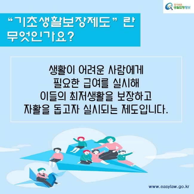 우리나라에는 모든 사람이 기본적으로 편안하게 살 수 있도록 도와주는 법이 있어요. 그 법의 이름은 '국민기초생활 보장법'이에요. 이 법에 따라서 정부는 도움이 필요한 사람들에게 돈이나 다른 서비스를 지원하게 되는데 이를 '기초생활보장제도'라고 부르죠.