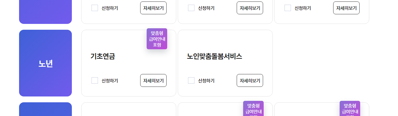 4. 메뉴를 내리다보면 노년 > 기초연금 메뉴가 있습니다. 신청하기에 체크박스를 누르고 자세히보기를 눌러주세요.