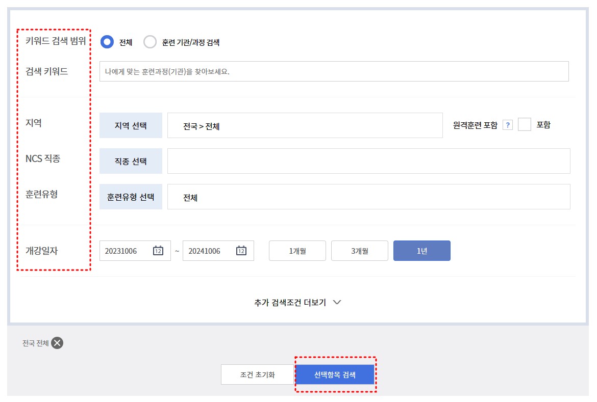 강의를 검색하는 방법으로 키워드, 지역, NCS 직종, 훈련유형, 개강일자 등 세부 조건을 입력하시어 본인에게 맞는 강의를 찾아볼 수 있습니다.