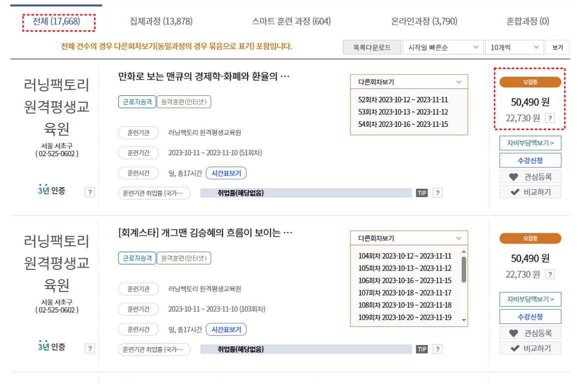 조회 결과 화면에 몇 개의 교육이 있는지 알려주며, 강의 제목과 훈련기관, 훈련기간, 훈련시간 등 자세한 내용을 확인해보실 수 있습니다.