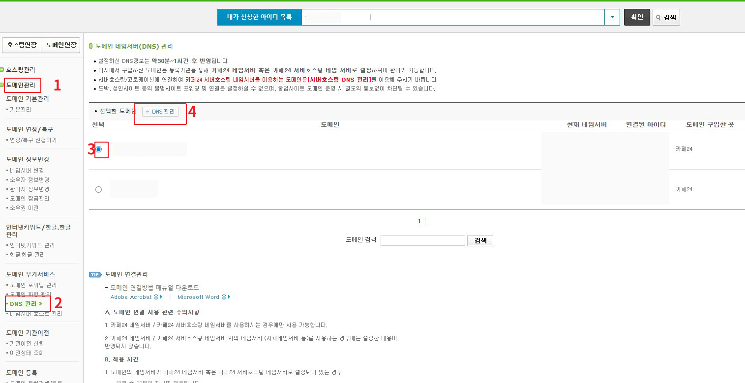 왼쪽 메뉴에서 도메인 관리 > DNS 관리 > 도메인 선택 > DNS 관리 로 들어가 줍니다.