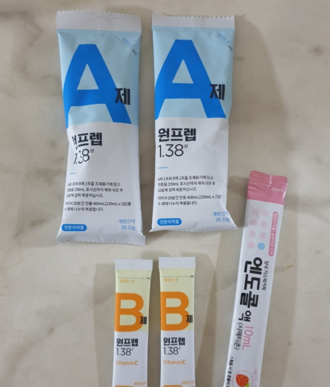 오라팡 알약과 다른 물약들을 비교해보면, 오라팡은 간편하게 삼킬 수 있는 대신 물을 최소 2L 이상 마셔야 해요. 반면, 원프렙 1.38 같은 물약은 물의 양이 줄어들어 복용이 좀 더 수월해졌죠. 레몬향에 약간의 탄산이 있는 맛이어서 마시기 편했어요.