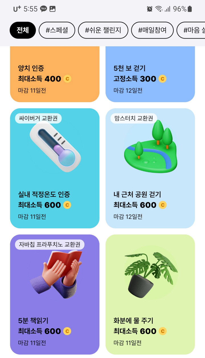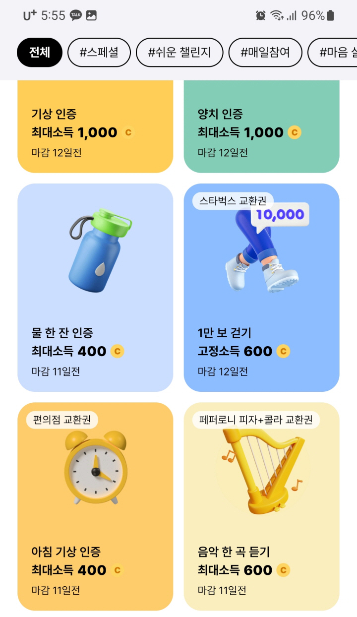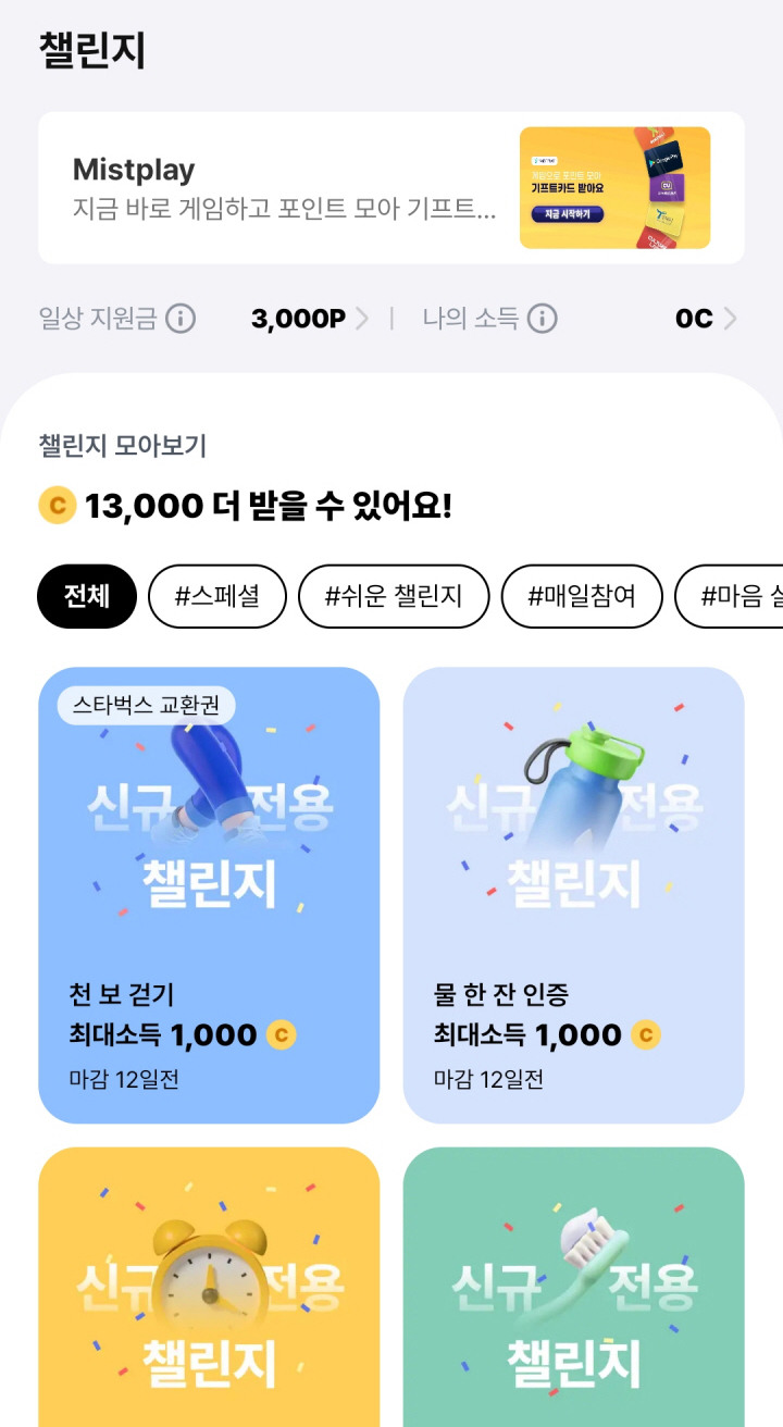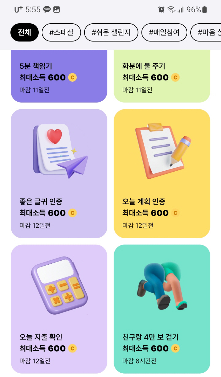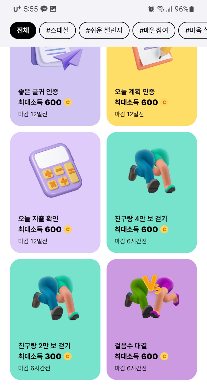 다양한 주제와 난도의 챌린지가 제공되며, 참가자들은 소액을 벌기 위해 고난도 챌린지에 도전하기도 합니다. 이것은 습관 형성과 동기부여를 결합한 자기 계발과 소득 증대의 흥미로운 방법입니다.