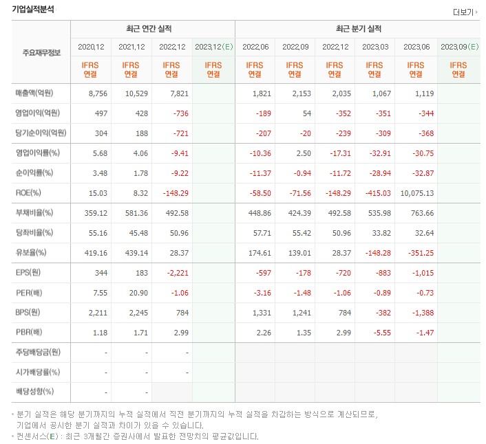 위니아는 코로나 이후부터 이익을 줄었는데, 2022년에 경영이 악화되면서 큰 폭으로 적자를 냈습니다. 올 상반기는 695억원 영업 적자를 냈고, 지난해 영업 적자인 437억 원을 훌쩍 넘어선 수준입니다.