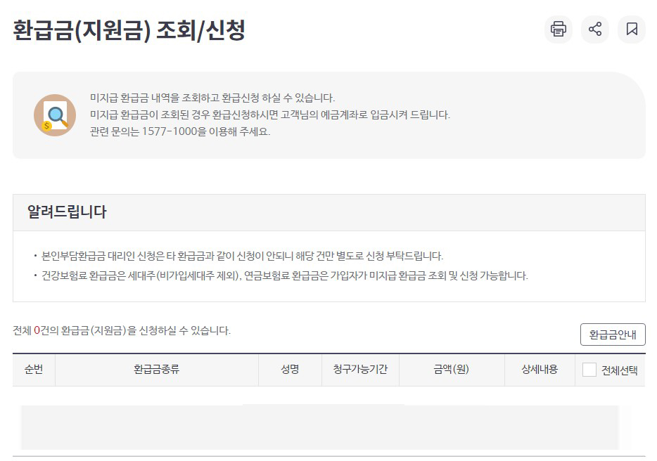 만약 환급액이 존재하는데도 불구하고 찾아가지 않는 경우에는 소멸시효 관련법에 의거하여 보험료를 납부한 날로부터 건강보험의 경우 3년, 국민연금의 경우에는 5년 이내에 신청하지 않는 경우 돌려받을 수 있는 권리가 소멸되기 때문에 반드시 기간내에 조회 및 신청하시어 지급받으시면 되겠습니다.
