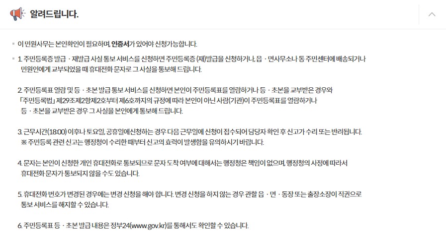 | 주민등록증 발급 | 주민등록증의 발급 또는 재발급 사실을 본인에게 통보 |