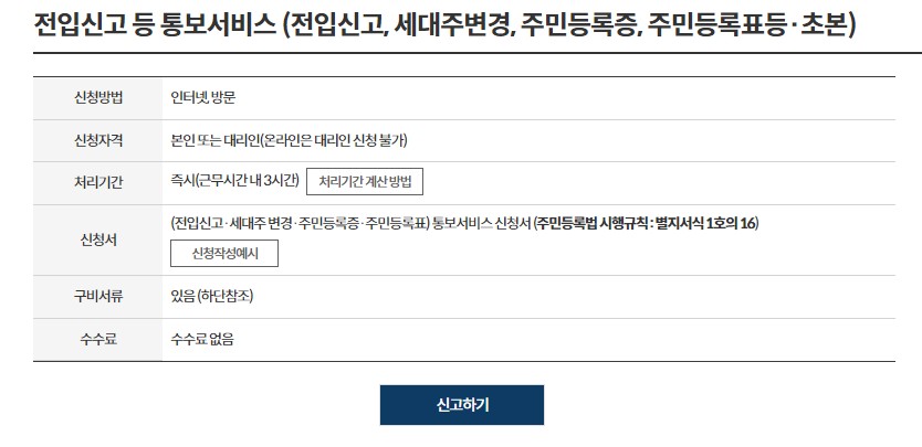 그렇기 때문에 전입신고 통보서비스를 무료로 신청하면 전입신고하게 되었을 경우 내 핸드폰으로 알려주게 되는 서비스입니다.