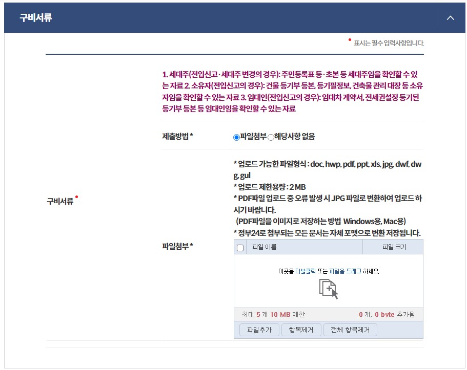 4) 임대인(전입신고의 경우): 임대차 계약서, 전세권설정 등기된 등기부 등본 등 임대인임을 확인할 수 있는 자료