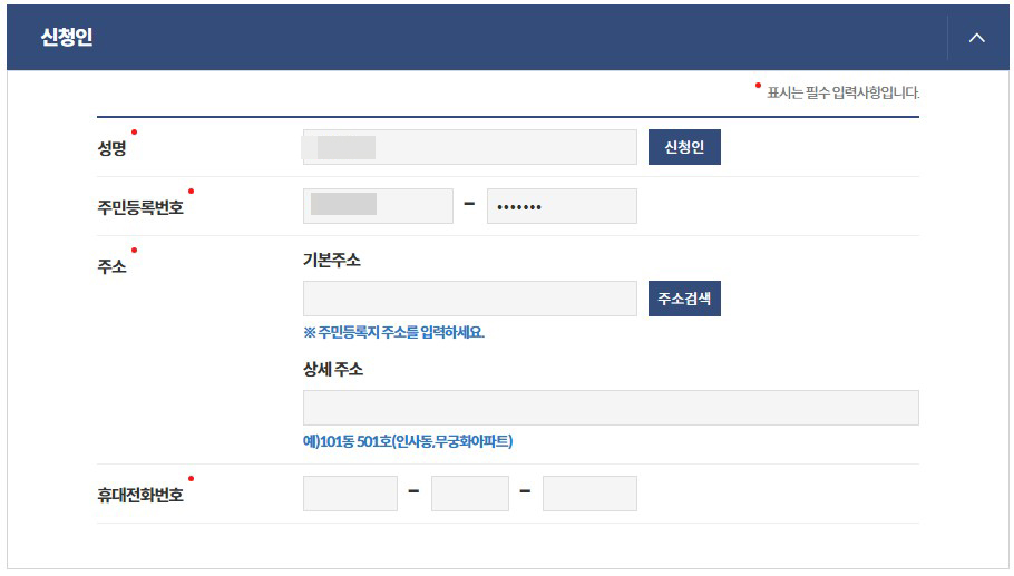 6. 신청인 정보를 입력하고 통보받은 휴대전화 번호를 입력해 줍니다.