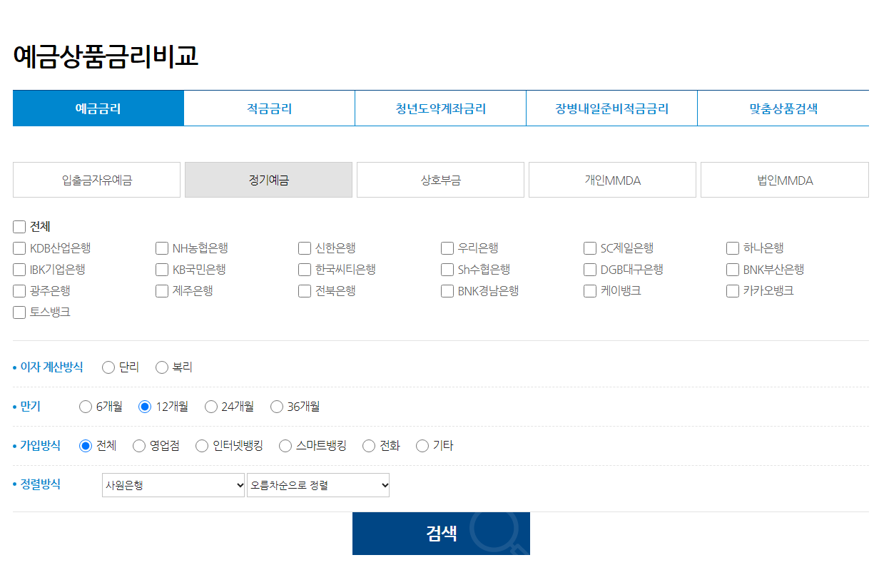 4. 본인에게 맞는 검색 조건을 선택하고 검색을 해줍니다. 선호하는 은행을 따로 고르실 수도 있고, 전체 은행을 선택하고 만기 날짜를 변경해서 검색해볼 수 도 있습니다.
