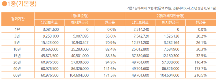 먼저 가입 기간이 긴 분들이라면 만기 환급금을 먼저 확인해보시는 것이 좋습니다. 분명 도중 해지보다는 만기시 돌려받을 수 있는 혜택이 더크기 때문이죠. 다음은 하나생명의 종신보험 1종, 2종, 3종에 대한 예시입니다.