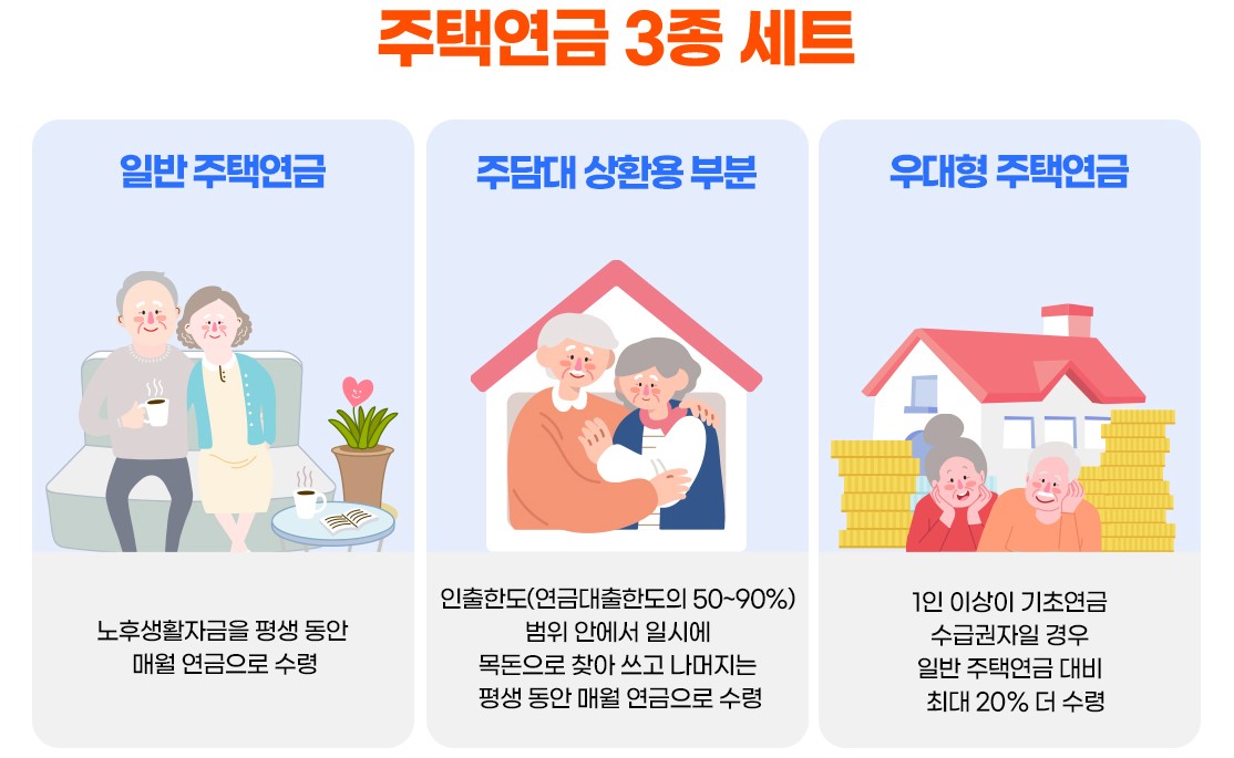 주택연금은 일반 주택연금, 주담대 상환용 부분, 우대형 주택연금 이렇게 3종류로 나눌 수 있습니다.