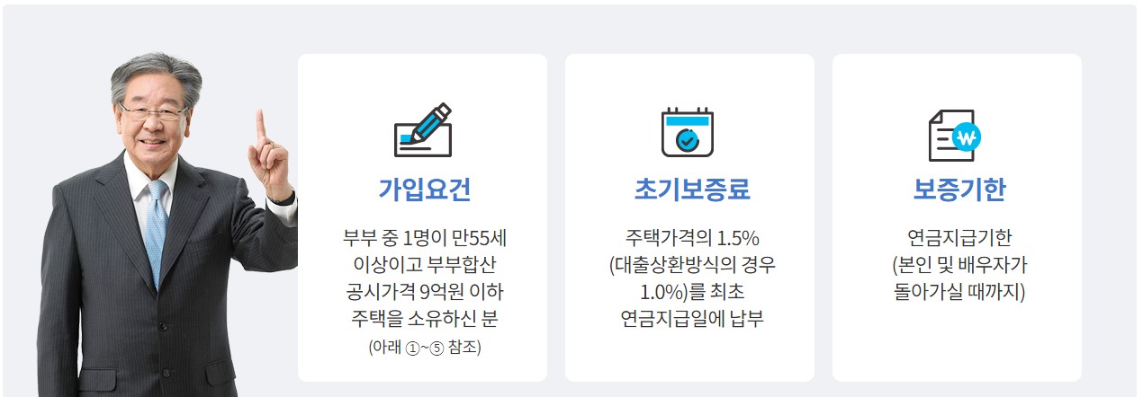 ※ [한국주택금융공사법] 개정 및 시행 예정으로 2023년 10월 12일부터는 가입조건 주택 가격이 공시가격 9억 원에서 12억 원으로 변경됩니다.