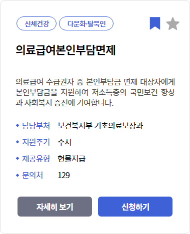 혜택: 병원 이용 시 본인부담금 전액 면제(비급여 제외)