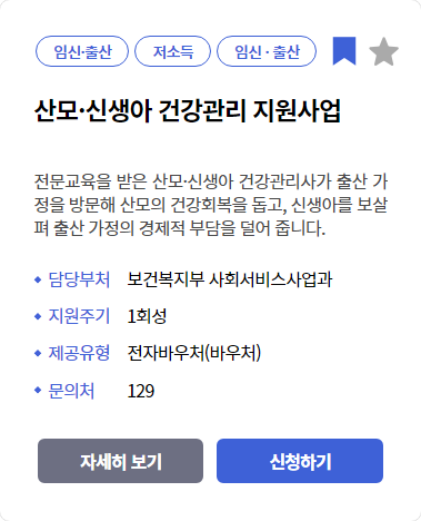 혜택 : 전문 교육울 받은 산모·신생아 건강 관리사가 출산 가정을 방문해 산모의 건강회복을 돕고, 신생아를 보살펴 출산 가정의 경제적 부담 지원
