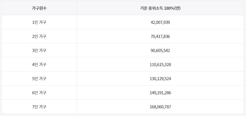 가구소득은 가구원 수에 따른 기준 중위소득 180% 이하에 해당하는 사람만 가능하며, 가구원은 신청자 본인과 본인 주민등록표 등본상에 배우자, 부모, 자녀, 형제나 자매(미성년자)를 기준으로 판단합니다.