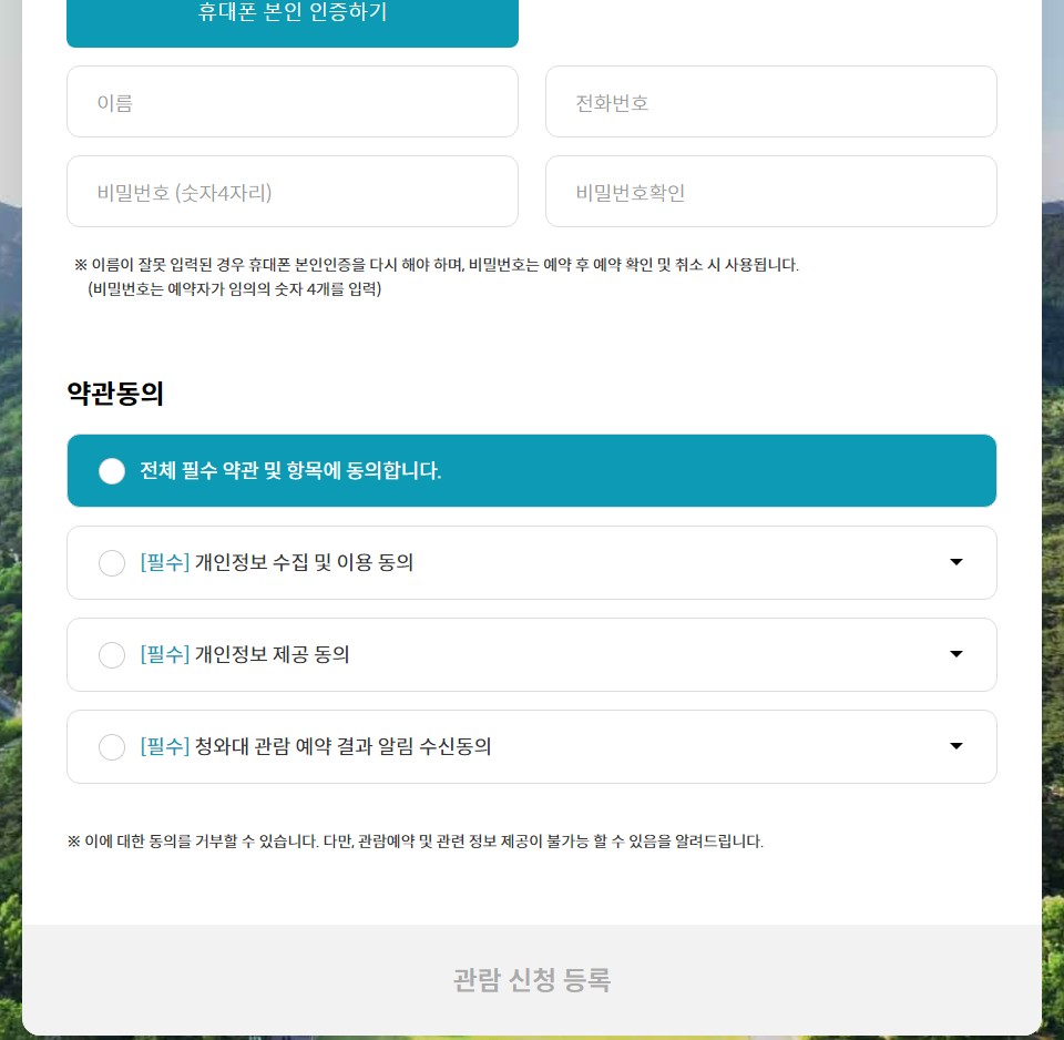 휴대폰 본인 인증하기를 해주시고요, 약관의 동의 후 관람 신청 등록하시면 신청이 완료됩니다.
