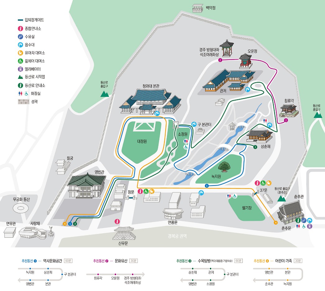 청와대 관람 안내도를 따라 추천 동선에 맞게 움직이시면 보다 관람을 편하게 하실 수 있습니다.