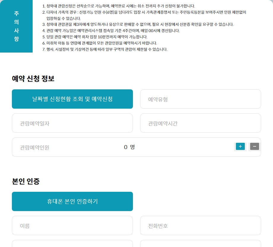 개인관람은 6명 이하이며, 단체 관람 신청은 20~50명 이하, 만 65세 이상 어르신과 장애인, 국가보훈대상자, 외국인은 6명 이하만 관람 신청이 가능합니다.
