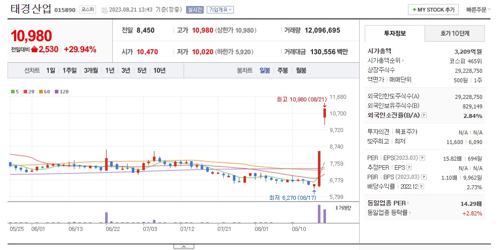 이에 비해 태경산업은 PBR 1.10배, PER 15.82배로 굉장히 안정적인 기업입니다. 기업자체에 관심이 있으신 분들은 단기적인 관심이 없어진 이후에 들여다보시면 좋을 것 같고, 맥신 테마에 동참하고 싶으신 분들은 지금이 타이밍이라고 보고 있습니다.