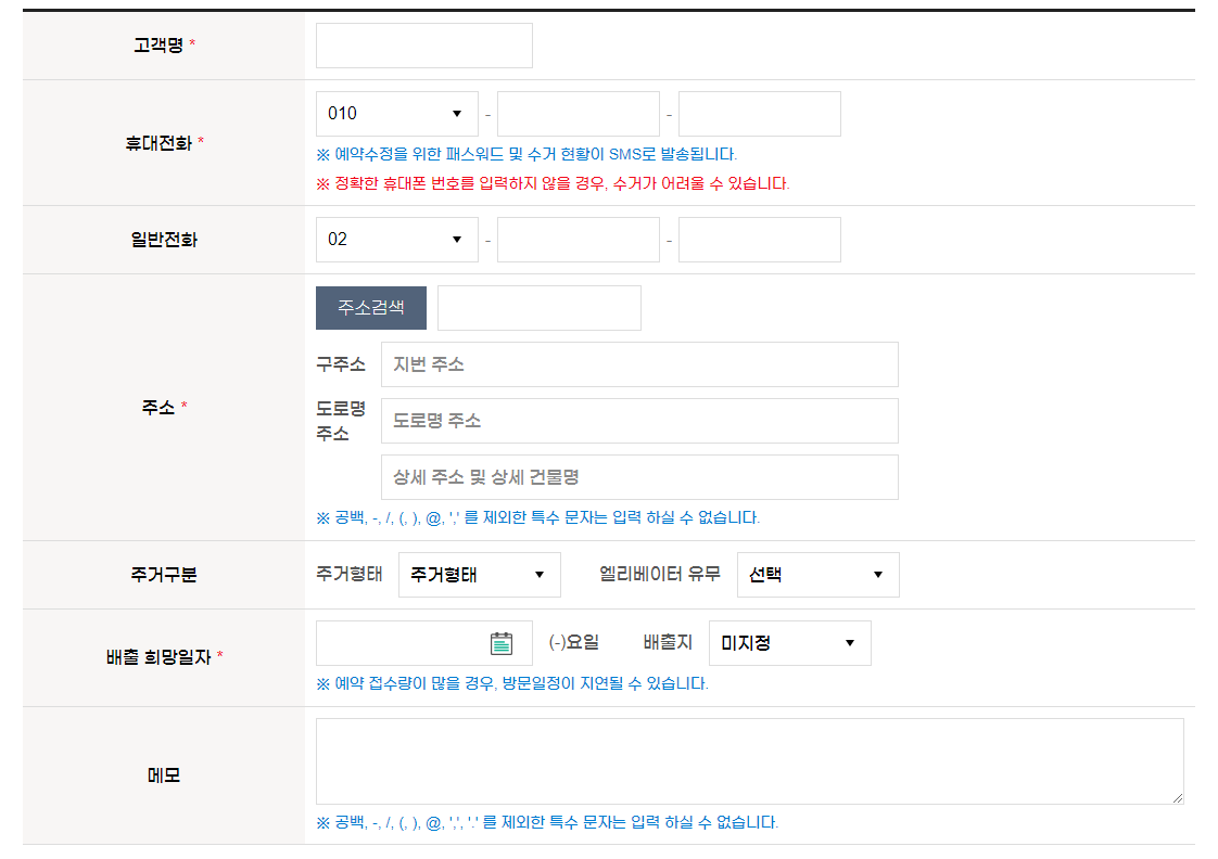 사이트에 접속하면, 수거예약하기 버튼을 누르고 간단한 고객 정보를 입력하면 돼요. 이름, 연락처, 주소 등 기본적인 것들이죠. 그리고 배출 희망일자와 배출지를 선택합니다.