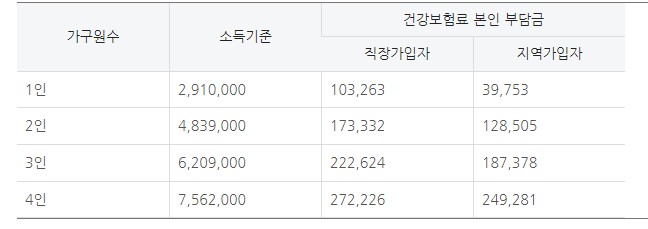 소득요건은 중위소득 140% 이하인 자로서 아래 기준표를 참고하시길 바랍니다.